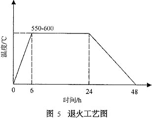 殘余應(yīng)力會(huì)引起鋼件在使用一定時(shí)間以后,或在隨后的切削加工中產(chǎn)生變形或裂紋。耳軸退火主要用來消除堆焊造成的殘余應(yīng)力、細(xì)化金相組織。采用局部退火裝置:制作一鋼筒,鋼筒內(nèi)、外襯石棉,內(nèi)盤電熱絲;鋼筒一端開口,套在耳軸上開口部與包體焊接固定;退火時(shí)鋼筒四周覆石棉,鋼包內(nèi)耳軸位置覆石棉;對(duì)每只鐵水罐退火過程嚴(yán)格按照?qǐng)D5所示溫度曲線要求。