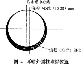 對(duì)煉鐵廠100 t鐵水罐的耳軸磨損進(jìn)行了分析,通過耳軸彎曲強(qiáng)度核算,確認(rèn)需修復(fù)磨損量。通過對(duì)焊縫強(qiáng)度校核,證明更換耳軸的方案不可行,從而選用耳軸表面堆焊的處理工。焊后采用退火處理,以消除焊接殘余應(yīng)力,效果良好。